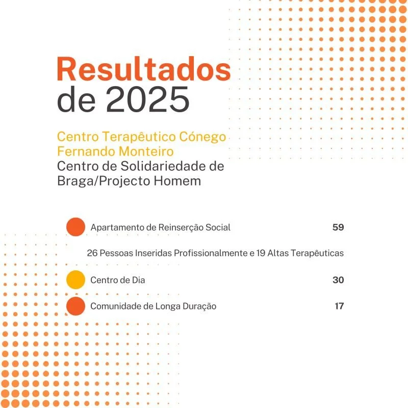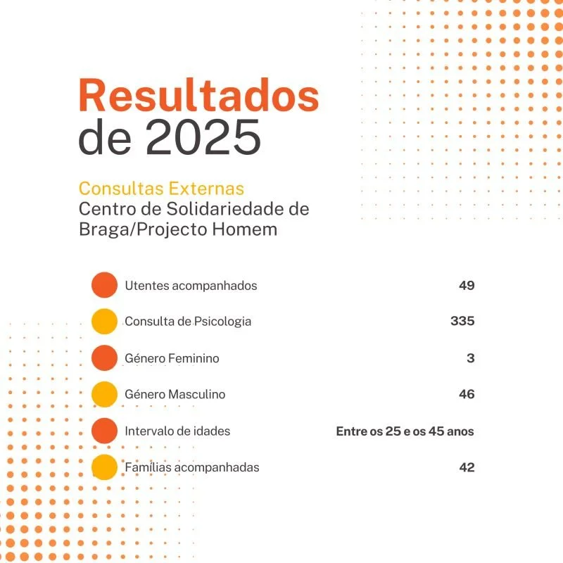 O serviço de Consultas Externas do Centro de Solidariedade de Braga-Projecto Homem, cujo objetivo é avaliar e diagnosticar a problemática e necessidades de pessoas com comportamentos aditivos e dependências com ou sem substância, como o jogo a dinheiro, bem como promover a motivação para a mudança e o desenvolvimento do autocontrolo face ao comportamento aditivo, acompanhou em consulta de Psicologia 49 indivíduos durante o ano de 2025.