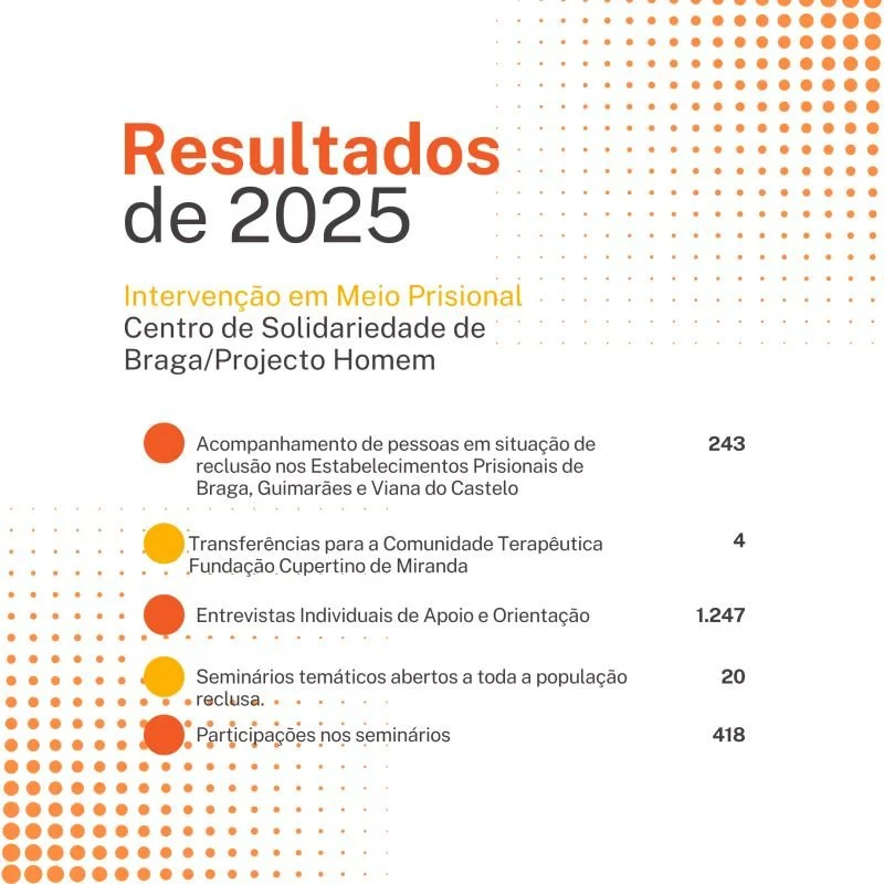 O projeto de intervenção em meio prisional acompanhou 243 pessoas em situação de reclusão nos Estabelecimentos Prisionais (EP) de Braga, Guimarães e Viana do Castelo durante o ano de 2025, destes, 4 casos foram transferidos para a Comunidade Terapêutica Fundação Cupertino de Miranda, do Projecto Homem, com vista ao tratamento.